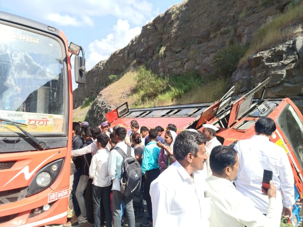 आयशर आणि चारचाकीच्या चढाओढीत घाट माथ्यावर बस पलटी ; ७० प्रवाशी सुखरूप ; मोठा अनर्थ टळला बॅगासाठी प्रवाशांनी तोडल्या काचा